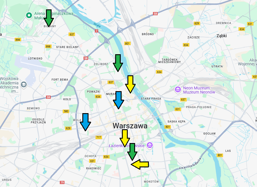 Przyjrzałam się dokładniej 8 miejscom, które chcę odwiedzić w tę noc. Podzieliłam je na 3 kategorie: „muszę zobaczyć” (kolor zielony), „chcę zobaczyć” (kolor żółty) oraz „mogę zobaczyć” (kolor niebieski) – to podział względem skali jak bardzo mi zależy by odwiedzić te miejsca. Następnie oznaczyłam adresy tych miejsc orientacyjnie na mapie Warszawy (zwyczajnie w programie Paint). Na sam koniec przeanalizowałam możliwości dojazdu pomiędzy wszystkimi miejscami. Brałam pod uwagę tylko komunikację miejską (według mnie jazda samochodem po zatłoczonej Warszawie w środku takiego eventu mogłaby być co najmniej męcząca…).