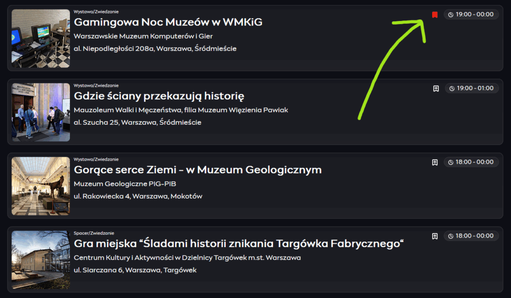 Najpierw zapoznałam się ze stroną i oferowanymi przez nią funkcjami. Moim pierwszym krokiem w planowaniu był szybki przegląd wszystkich możliwych miejsc w Warszawie (jest opcja filtrowania, bo pokazywane są też miejsca z miast sąsiadujących ze stolicą). Dostępne są one w zakładce Wydarzenia. Przy każdej propozycji był typ atrakcji (wystawa, zwiedzanie, spacer itp.), tytuł, organizator oraz adres i dzielnica. Na początek wybrałam wszystkie interesujące mnie atrakcje (bez sprawdzania żadnych szczegółów) i oznaczyłam je symbolem czerwonej flagi, by zapisać na potem.