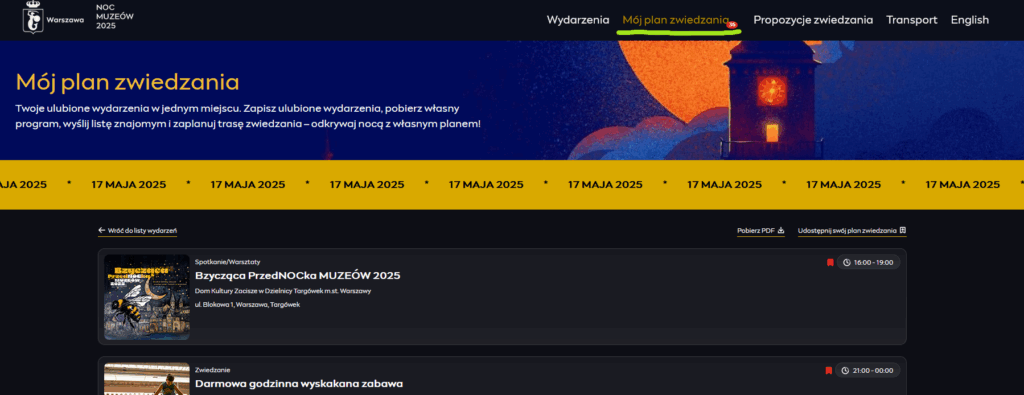 Postanowiłam, że 17 maja wybiorę się na Noc Muzeów do Warszawy, bo w tym roku to miasto najbardziej mi sprzyja jeżeli chodzi o lokalizację. Chcąc dokładnie zaplanować te kilka godzin (planowanie wszystkiego w życiu to moje największe hobby oraz przekleństwo jednocześnie) znalazłam stronę organizatora. Jaka ogromna była moja radość, gdy okazało się, że stworzyli system wsparcia dla planowania zwiedzania warszawskich miejscówek (tutaj link).